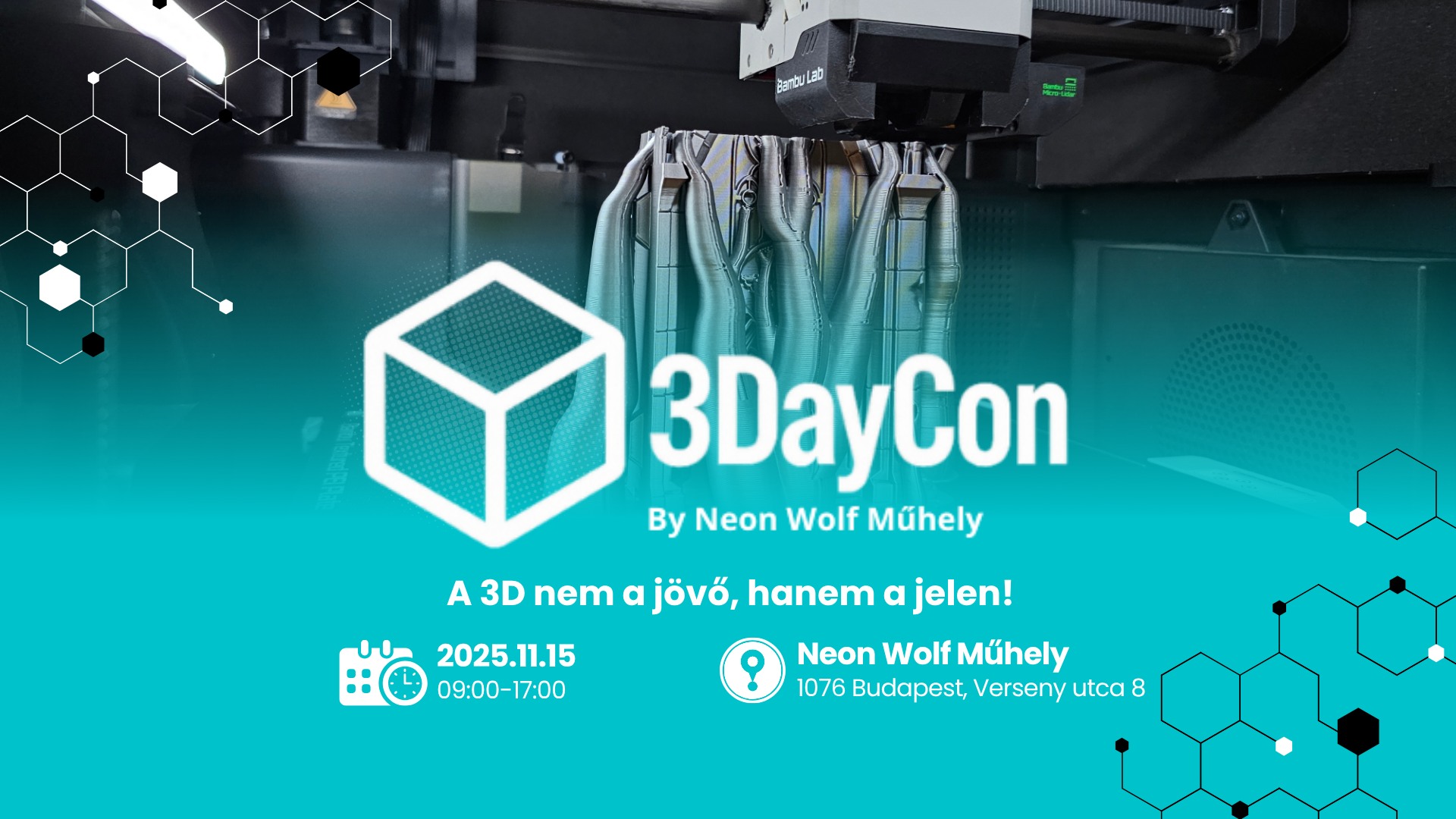 A 3DayCon egy nyitott, ingyenes (de regisztrációhoz kötött) rendezvény, amely a 3D technológia világába nyújt betekintést – közérthető módon, bárki számára. Legyen szó diákokról, barkácsolókról, hobbi nyomtatókról, művészekről, gamerekről vagy vállalkozókról, a rendezvény inspirációt és tudást kínál.